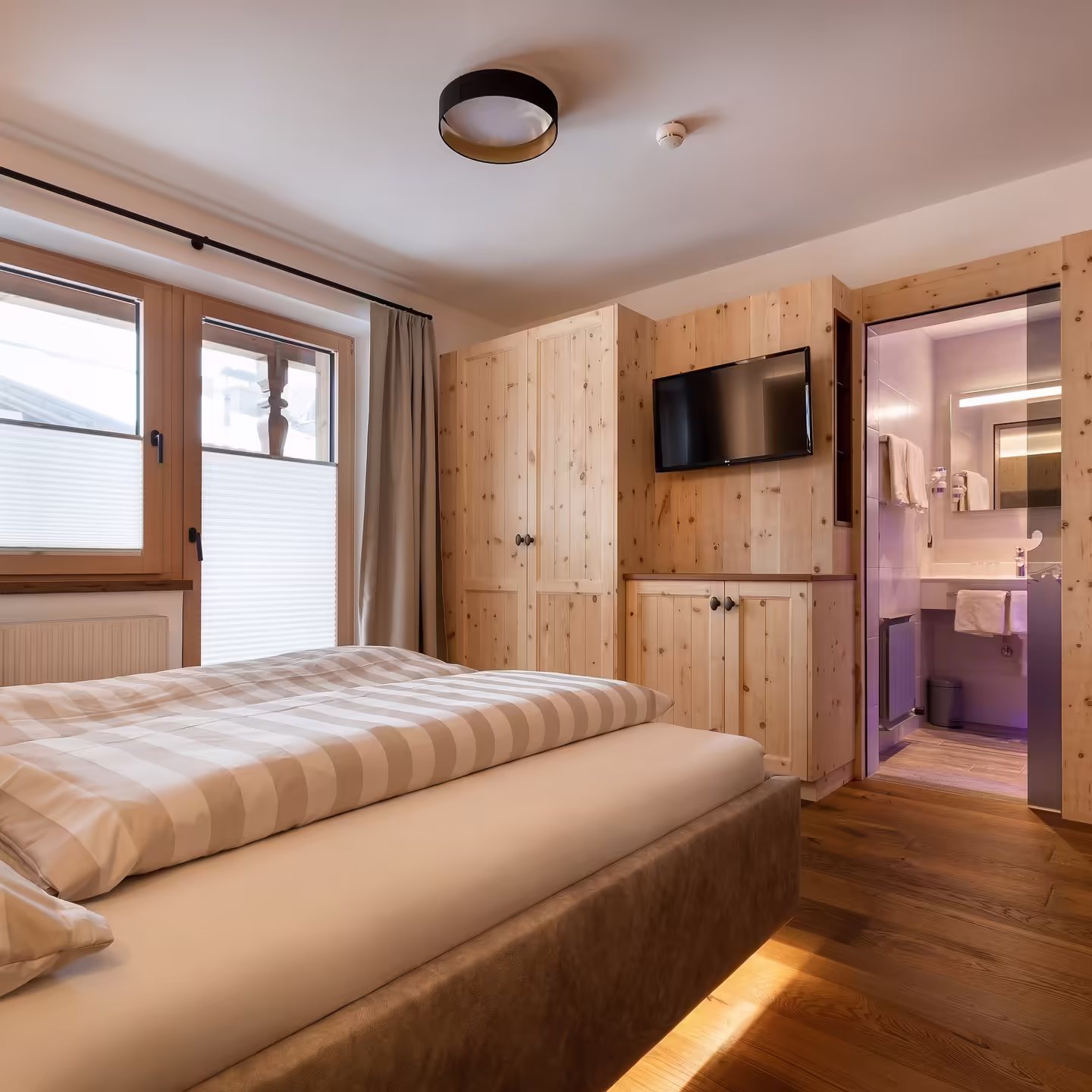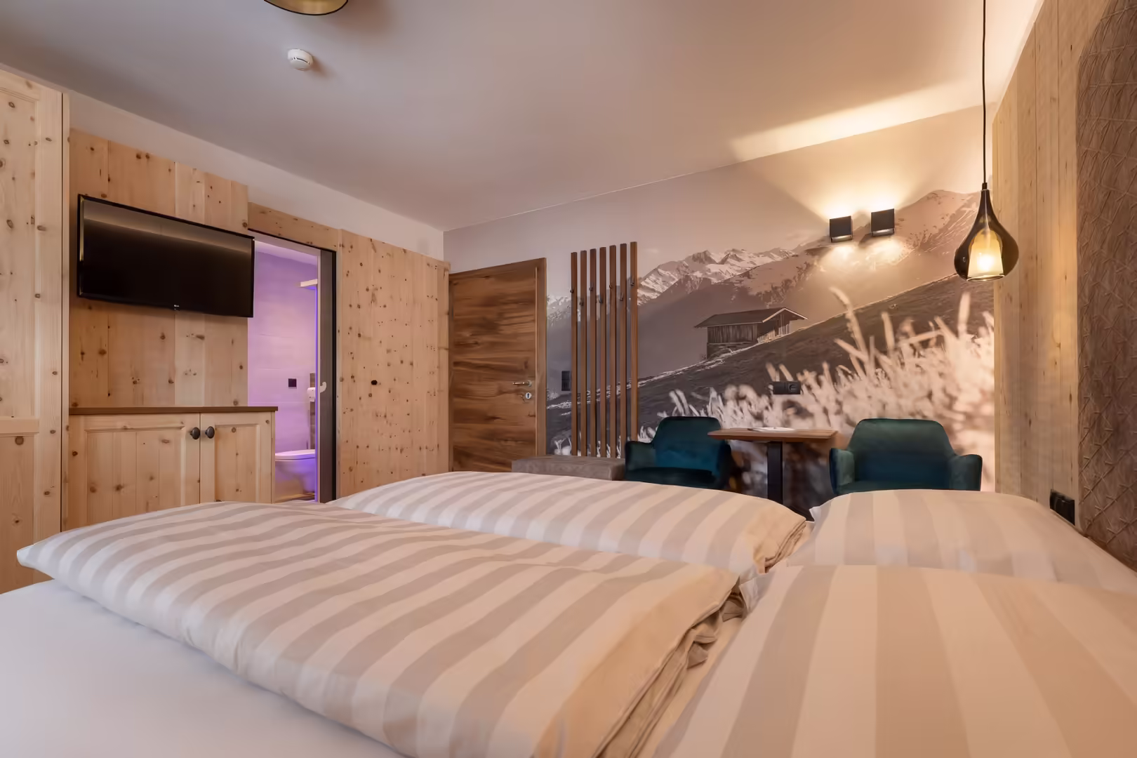 Mit gemütlichen Betten, zeitloser Einrichtung und liebevoll ausgewählten Details schlafen Sie ruhig und erholen sich nach einem aktiven Tag in den Bergen. Das Zimmer bietet Ihnen den Komfort, den Sie nach Wandern, Biken oder Skiurlaub im Zillertal verdient haben — und ist gleichzeitig ein Rückzugsort, an dem Ruhe und Natur im Mittelpunkt stehen.
