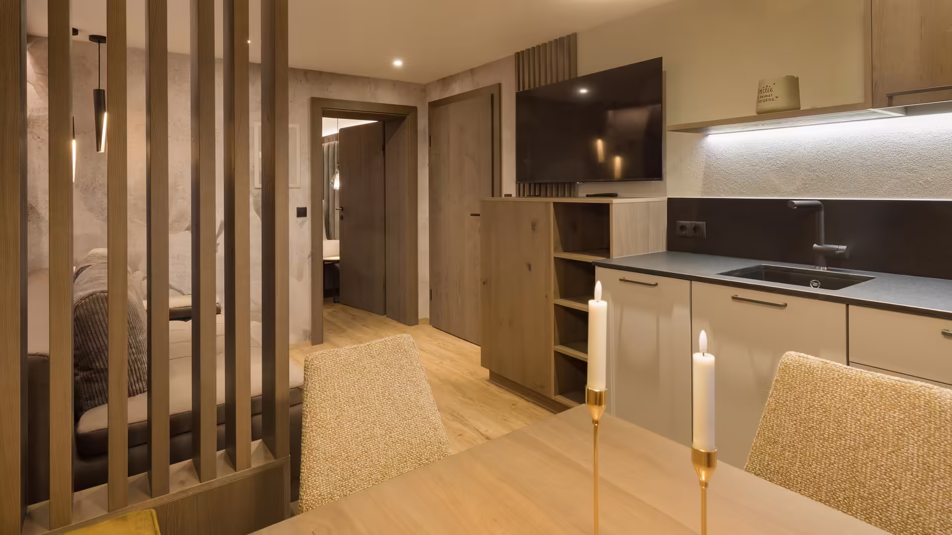 Zur komfortablen Ausstattung zählen ein Flat-TV, ein Kühlschrank sowie ein modernes Badezimmer mit Dusche und WC. Auf dem Balkon genießen Sie die frische Bergluft und einen entspannten Ausblick – ideal für romantische Auszeiten und erholsame Urlaubstage.